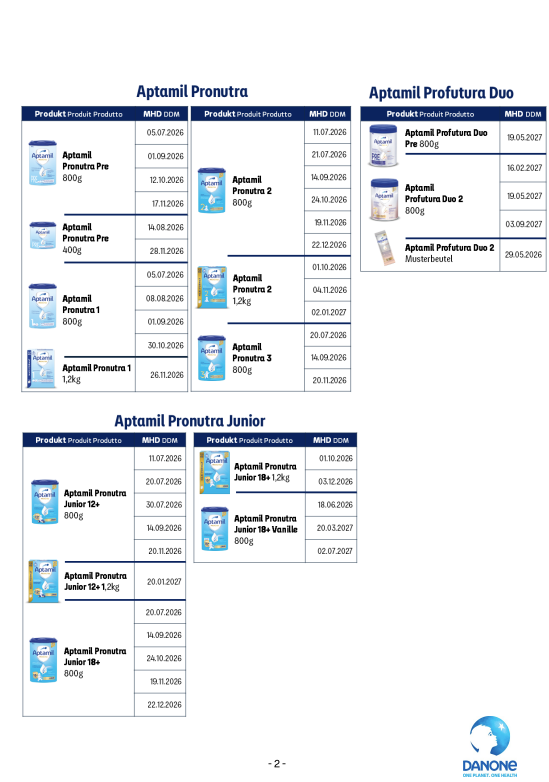 En concertation avec les autorités suisses, Danone rappelle en Suisse certains lots de production d’Aptamil, dans le contexte de la mise à jour des recommandations concernant le seuil de céréulide. Le rappel concerne les produits ci-dessous.